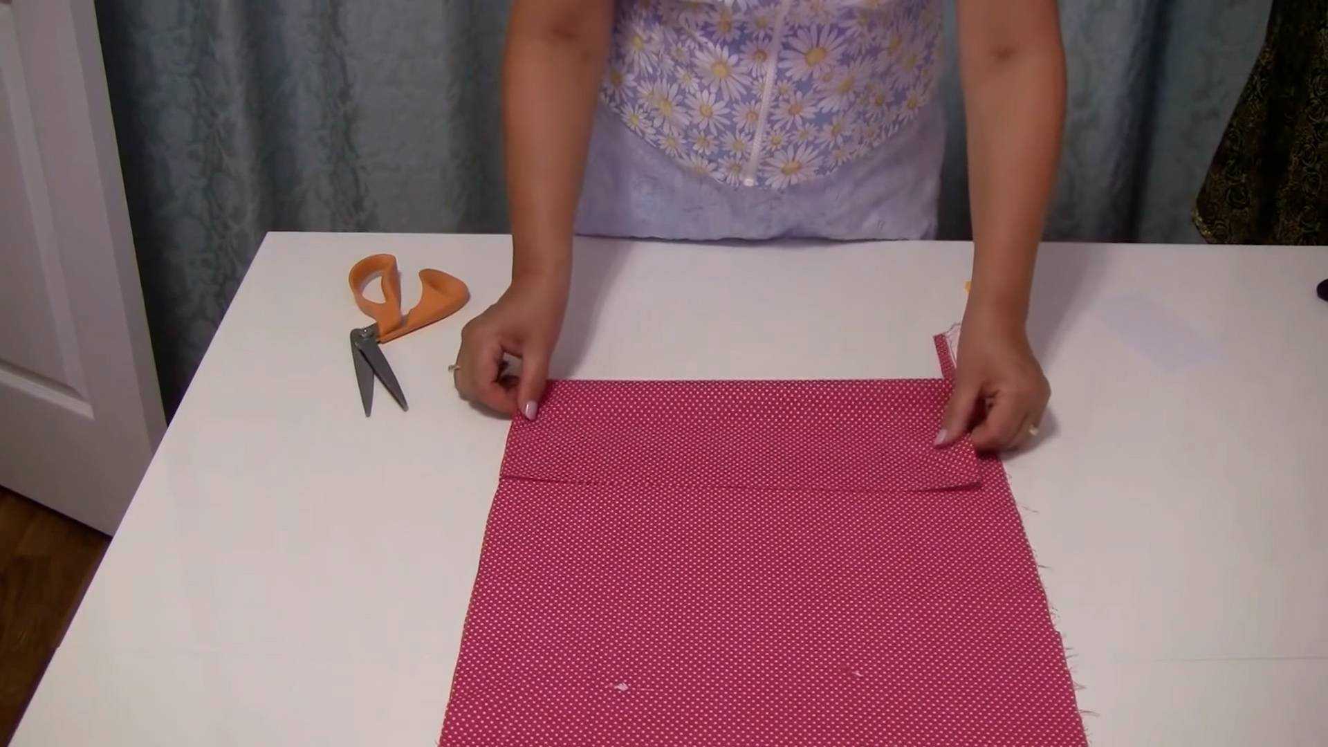 Детали складывают изнаночными сторонами внутрь и обметывают вручную при помощи отделочной ленты. Свободные концы лент можно оставить для будущих завязок. Далее следует сшить изделие любым окантовочным швом по периметру.