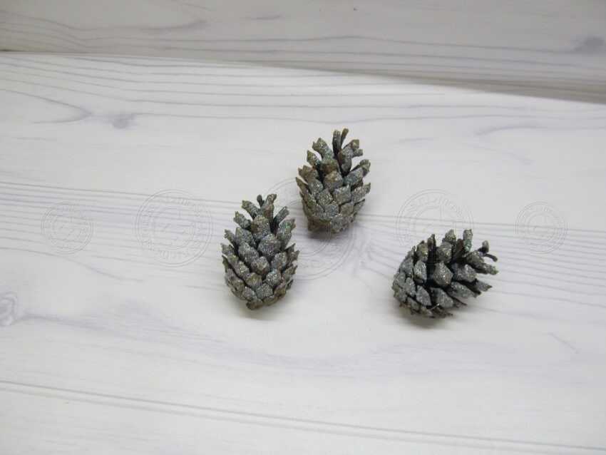 5. Обдуйте шишки, чтобы удалить с них гряз и пыль, после чего начинайте окрашивать. Аналогично тому, как мы посыпали блестками, наносите краску только снаружи, избегая попадания ее внутрь. Тем самым мы достигаем интересного эффекта контраста оттенка поверхностей.