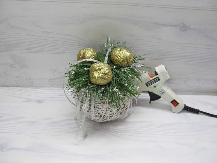 11. Теперь снова воспользуемся лентой, которой ранее мы уже пользовались. Нарезаем ее на кусочки, длина который равна диаметру шара. Приклеиваем их к верхней части сферы под ветками и пускаем по всему периметру. Нижняя сторона у них остается свободна, и никак не закреплена.