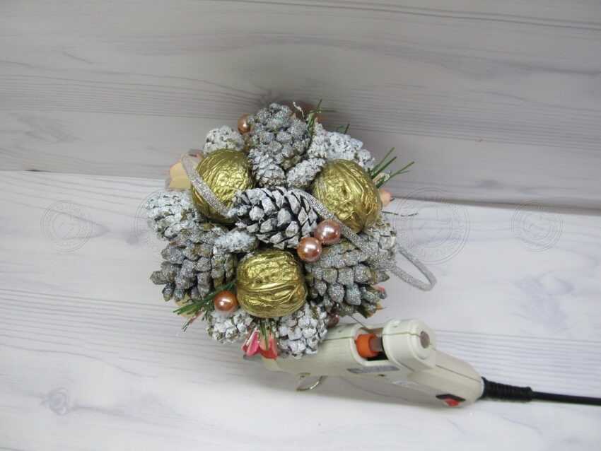 13. Большие шишки, которые были осыпаны блестками мы располагаем между грецких орехов. Они должны смотреть вниз.