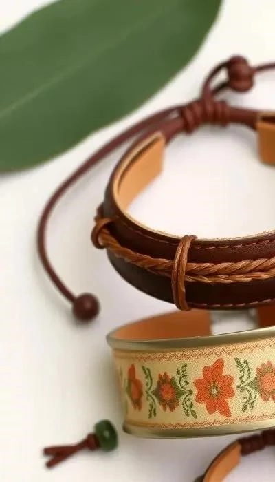 Особое внимание уделяется натуральным материалам и ручной работе. Браслеты из кожи с этническими мотивами, вдохновленными культурой разных народов, будут особенно актуальны. В дизайне приветствуются сложные плетения, тиснение и гравировка, придающие аксессуару уникальный вид. Влияние стиля бохо проявляется в использовании кисточек, бусин и перьев.