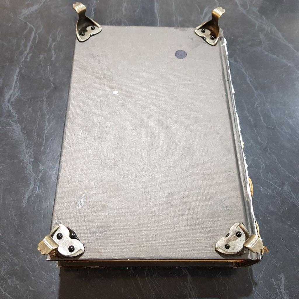 Чтобы книга больше походила на шкатулку для драгоценностей, я добавила несколько маленьких ножек. Этот аксессуар продается в магазинах для рукоделия. Чтобы прикрепить ножки к книге, я использовала горячий клеевой пистолет с черными клеевыми палочками. Обложка и рамка в центре сделаны с использованием готовых силиконовых форм и были заполнены эпоксидным клеем.