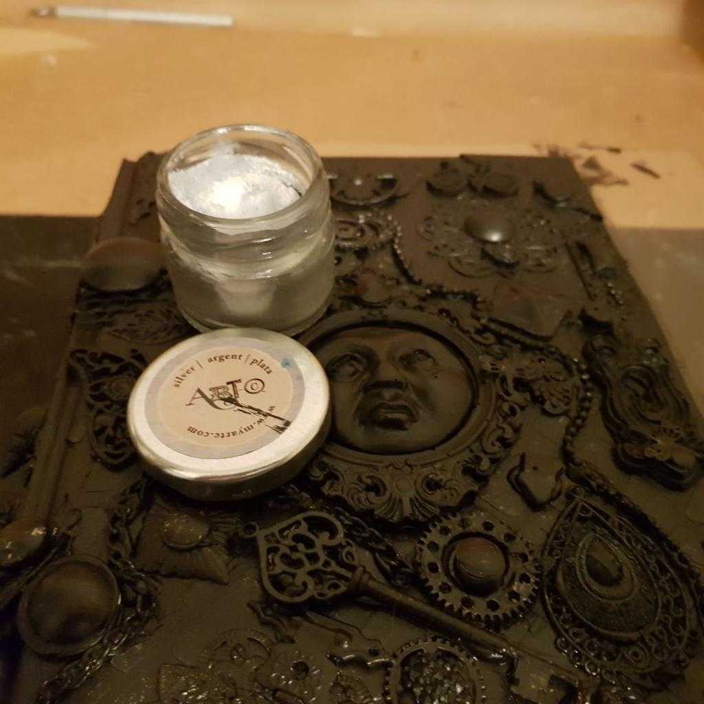 После того как все украшения были добавлены, вы можете покрасить все изделие. Для этого проекта я использовала черную и серебристую акриловые краски. Вы можете добавить любой цвет, в зависимости от вашего стиля украшения. Отличный способ быстро высушить краску — воспользоваться феном.
