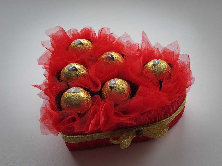 Это интересно: по той же схеме можно соорудить букетик и для мужчин, только изменив цветовую гамму. В этом случае основным компонентом должен выступать «Ферреро Роше», дополненный золотистой фольгой. Вместо органзы гармонично впишется черный (коричневый) атлас или бархат. Подобный подарок вполне будет уместен для коллеги на знаменательную дату.