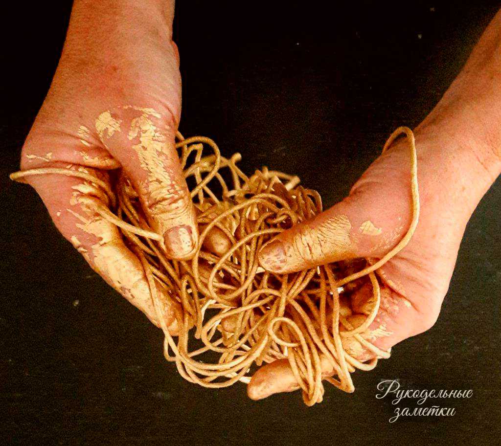 Готовую работу мастер тщательно промазывает разведенным в воде клеем ПВА. Дает ей полностью высохнуть, аккуратно отделает от пищевой пленки и лишнего клея, а потом декорирует золотистой акриловой краской.