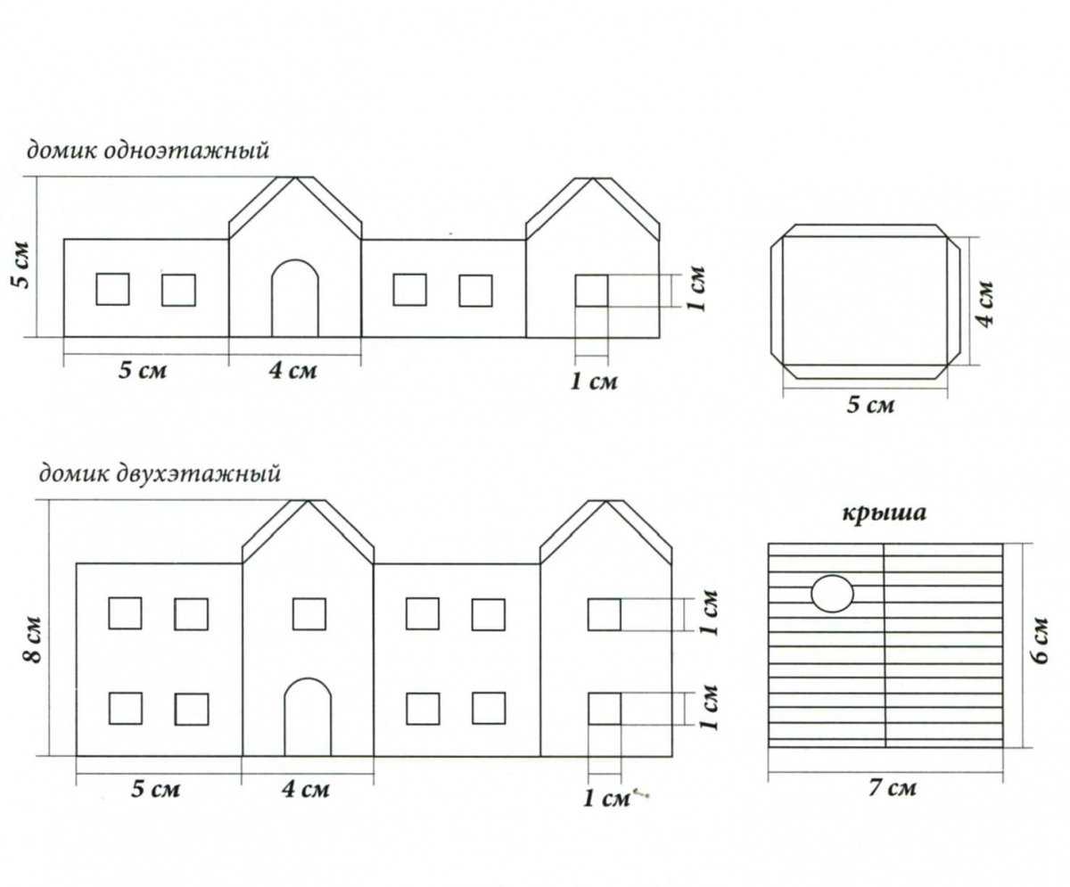 Следующая схема подходит для изготовления как одноэтажного, так и двухэтажного домика. Параметры основы, крыши и длины стен одинаковые для обоих вариантов. Высота зависит от количества этажей.