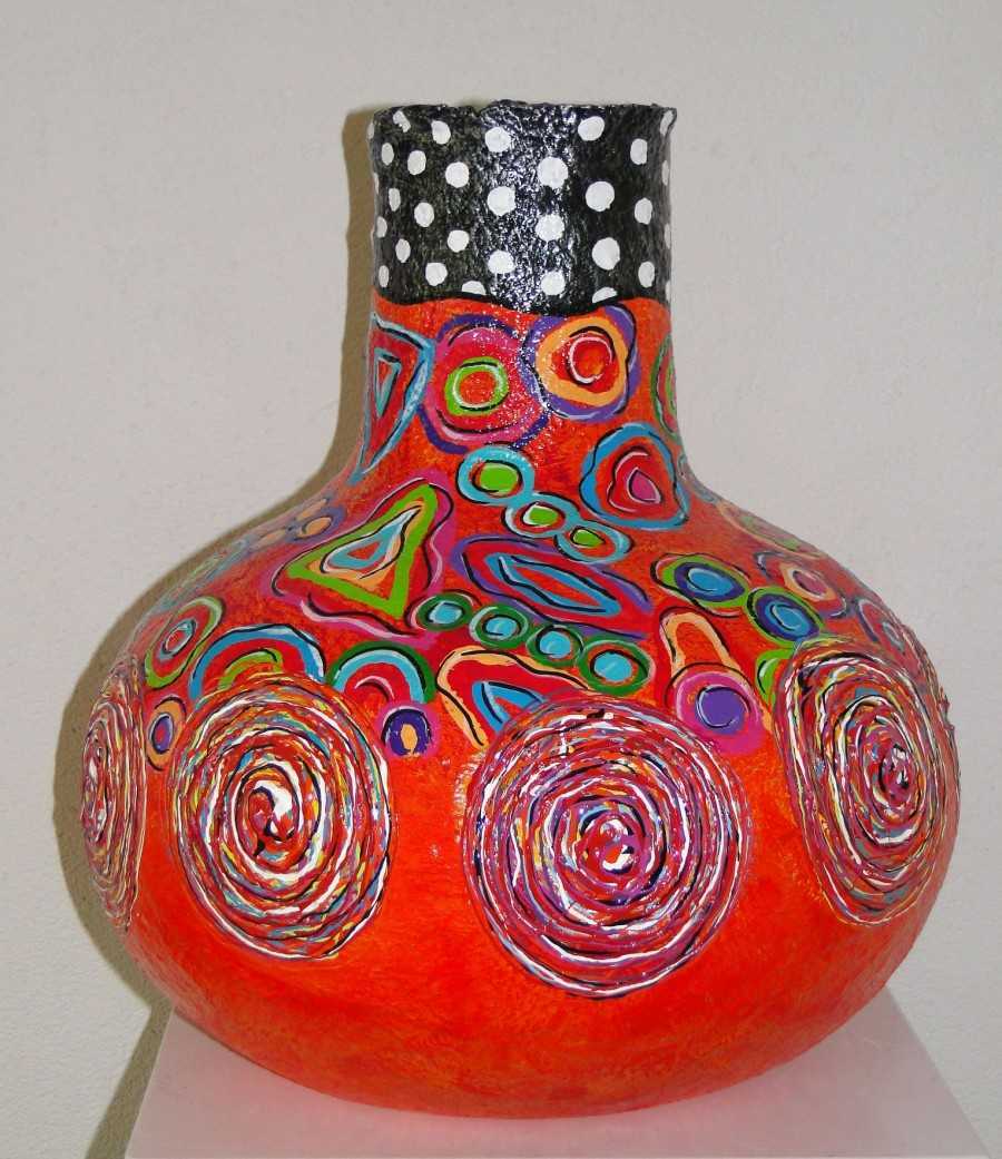 Из папье-маше получаются напольные вазы и цветочные горшки (кашпо). Основой для них послужат различные ненужные ёмкости. Например, цветочный горшок получится из пластикового или жестяного ведёрка, изящная напольная ваза – из картонного каркаса, греческая амфора – из керамической или стеклянной вазы подходящей формы. Необычная посудина получится склеиванием двух деталей: папье-маше на основе бутылки и округлой миски: