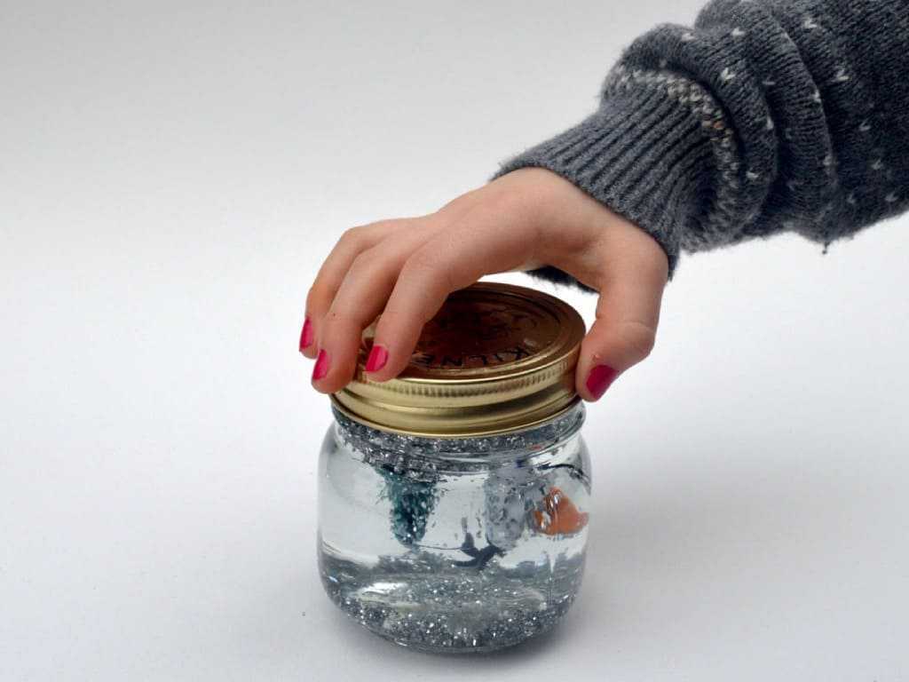 8. Накройте банку крышкой с украшениями и плотно завинтите. Для надежности можно промазать края банки клеем.