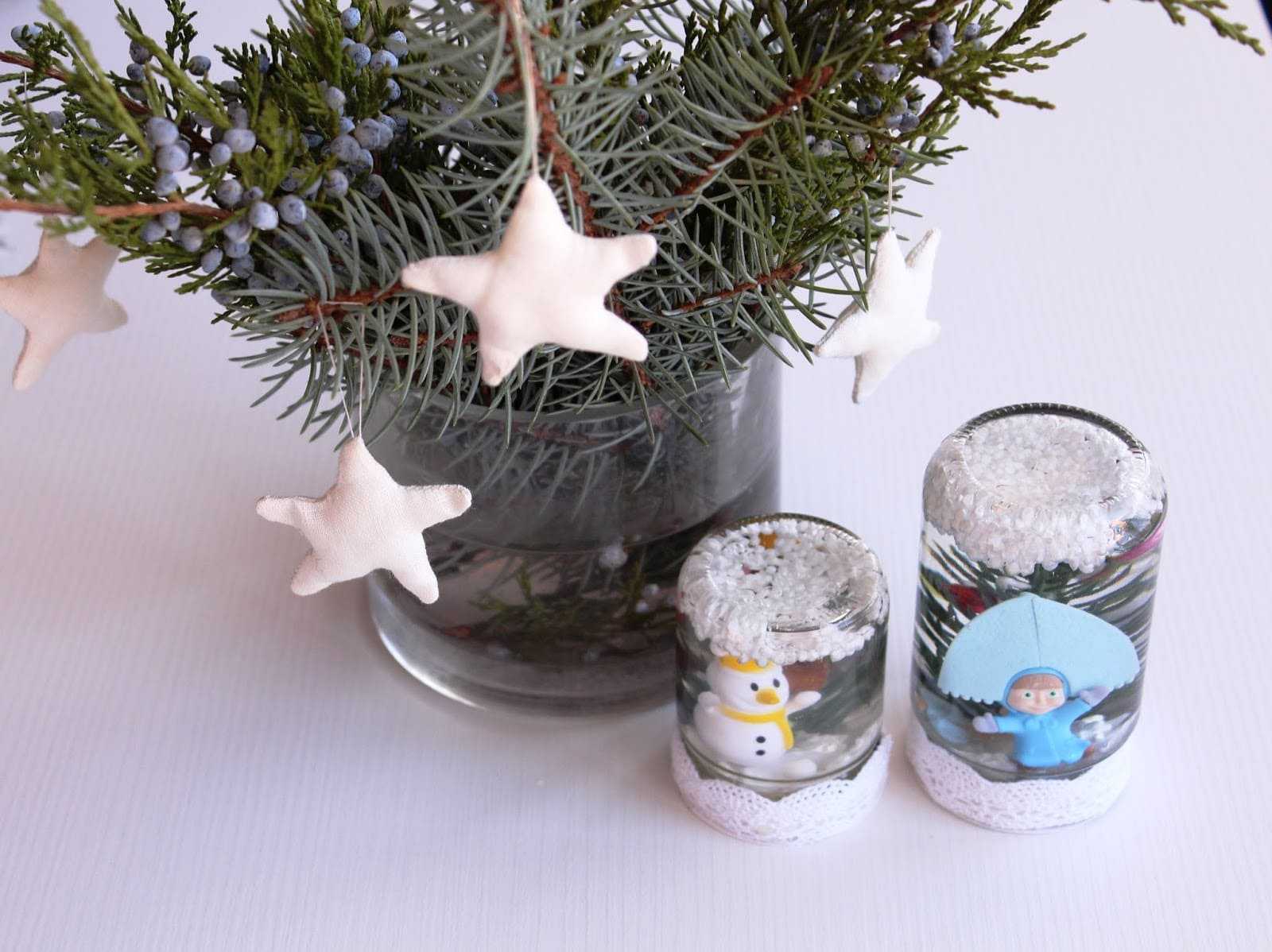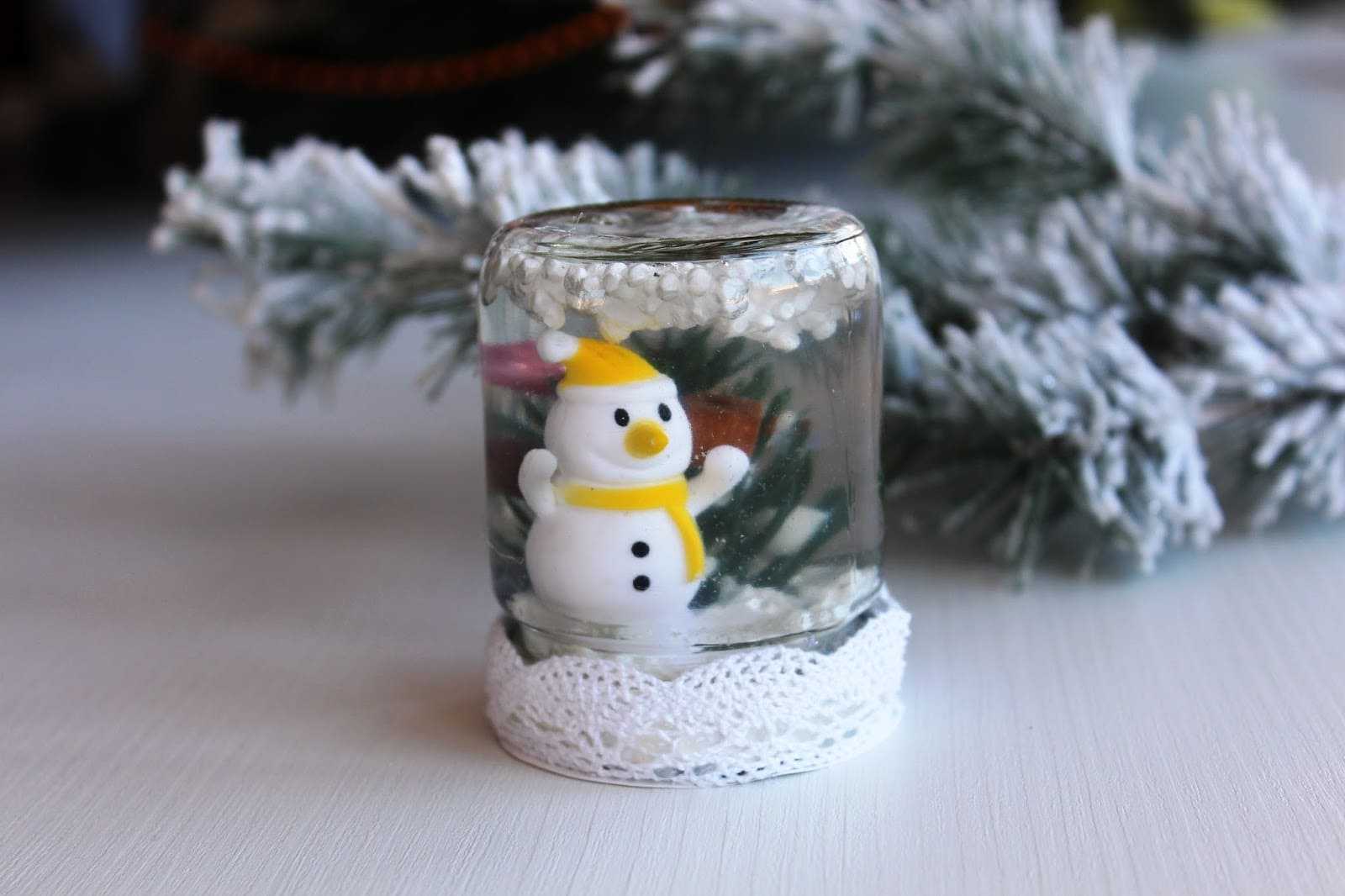 Совет: если не хотите возиться с жидкостями, можно сделать снежный шар и без них. Для этого подготовленную банку изнутри промазывают клеем ПВА и прикрепляют к стенкам блестки. К крышке фигурки приклеивают на Супер Момент или горячий клей. Завинчивают банку крышкой и новогодний сувенир готов! Эффекта падающего снега в нем не будет, но все-равно смотрится такое творение бесподобно.