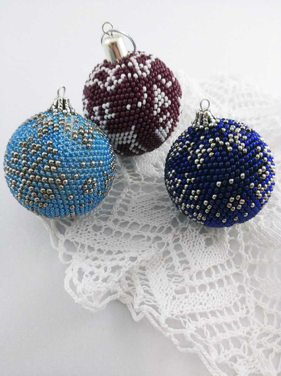 Для одного шара на елку берут 5 проволочек и бусины. Такая игрушка не разобьется, даже если случайно упадет на пол. Элементы из проволоки скручиваются между собой, чтобы получилась снежинка. На каждый из них нанизывают бусины.