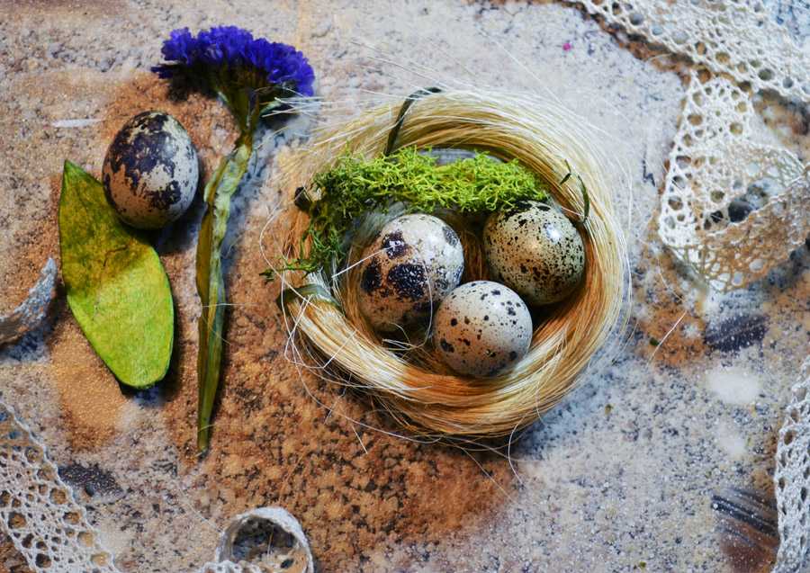 Проколов перепелиные яйца ножом, извлечь их содержимое, а сами яйца промыть и просушить, при желании затонировать с помощью акриловых красок. Из сезали сделать птичье гнездо, свернув ее в кольцо и перевязав. Приклеить яйца к гнезду. Для большей реалистичности, вставить в него сухие веточки и мох.