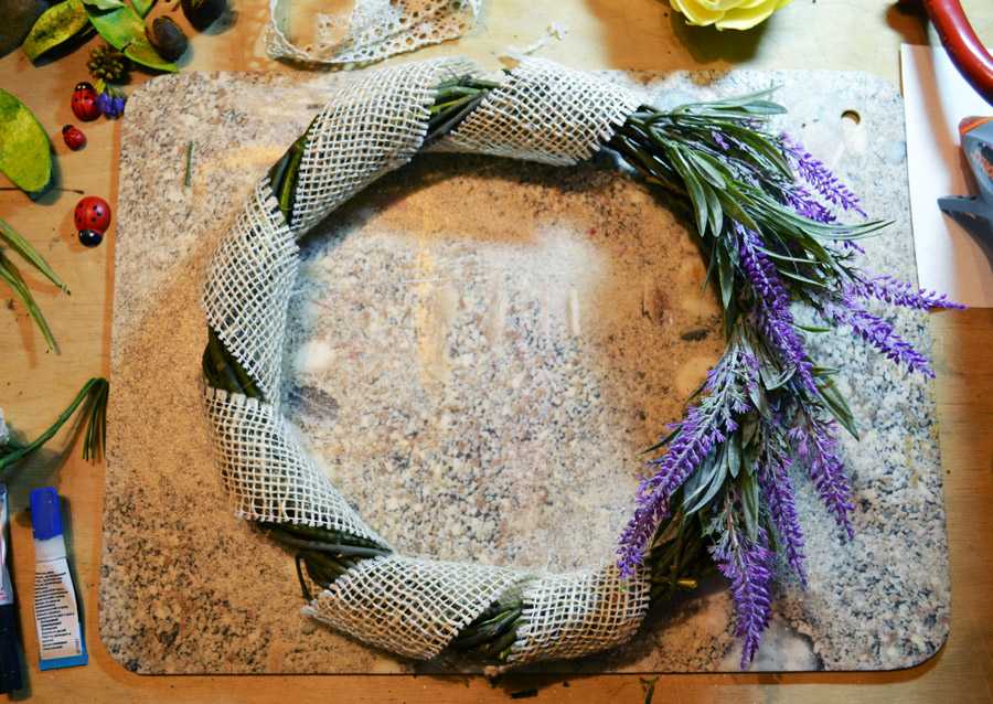Если кольцо-основа плотно обернуто бумажной или текстильной лентой, то искусственные цветы с тонкими проволочными стеблями можно надежно закрепить, просто заправив их под обмотку. Как это делается, показано на фото ниже.