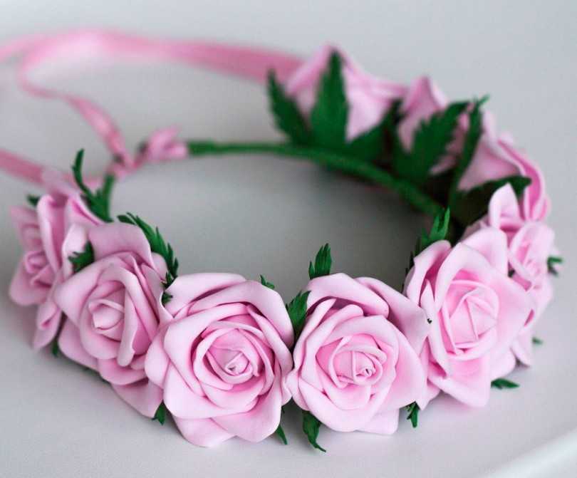 В день бракосочетания достаточно популярны сегодня свадебные венки из фоамирана. Особенно, если торжество проходит на свежем воздухе, а не в помещении загса