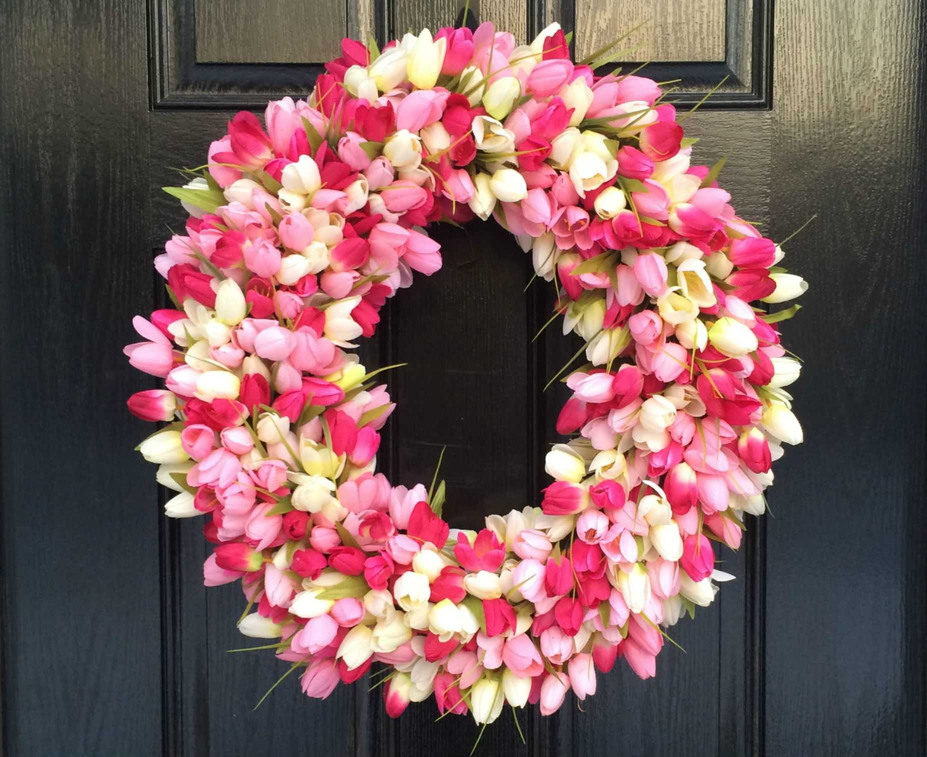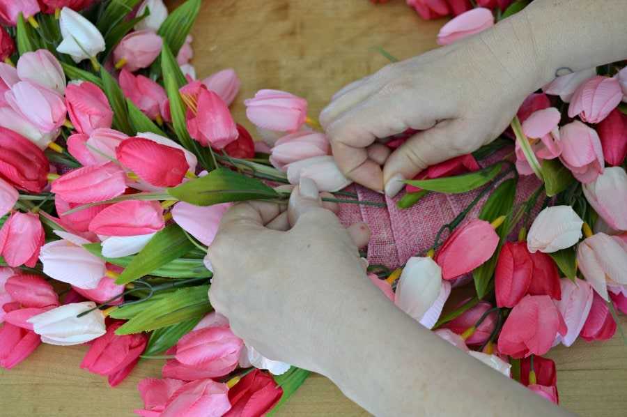 Более практичным решением при создании весеннего венка будет использование искусственных цветов. Чтобы закрепить их на кольце-основе, можно использовать: