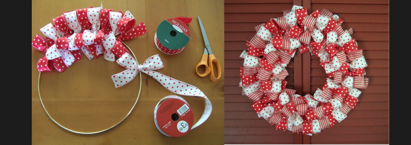 Оригинальный венок для украшения интерьера можно сделать, используя обычную ленту.