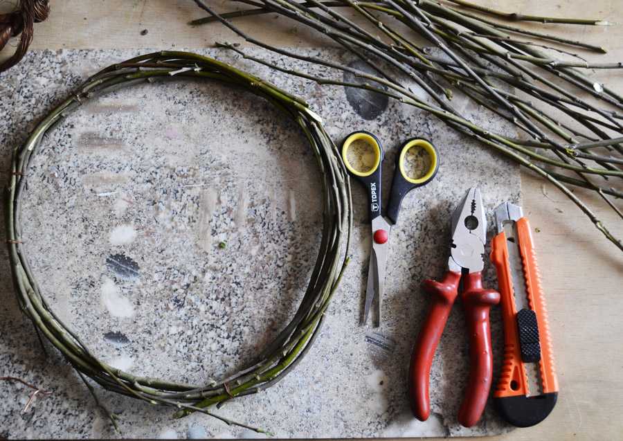 Для поделки лучше всего подходят ветки ивы, плакучей березы или винограда длиной около 80 см. Количество используемых веток зависит от того, какого объема будет венок. Если имеющийся материал гнется плохо, то его гибкость можно улучшить, замочив ветки на 30-40 мин. в кипятке.