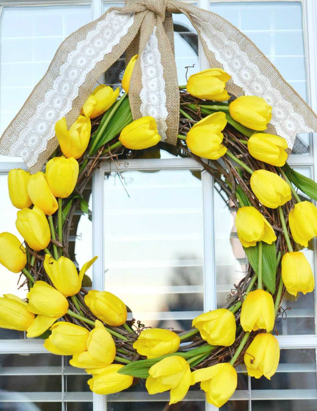 Используя кольцо-основу из веток, легко сделать венок с весенними цветами – мимозой, вербой, тюльпанами, мускари, ландышами. Чтобы цветы в венке быстро не завяли, необходимо внутрь венка поместить несколько пластиковых капсул с водой, как это показано на фото ниже. В них помещают кончики стеблей, и даже такие нежные цветы, как тюльпаны будут оставаться свежими очень долго. Венок из живых цветов привнесет интерьер весеннее настроение и радость.