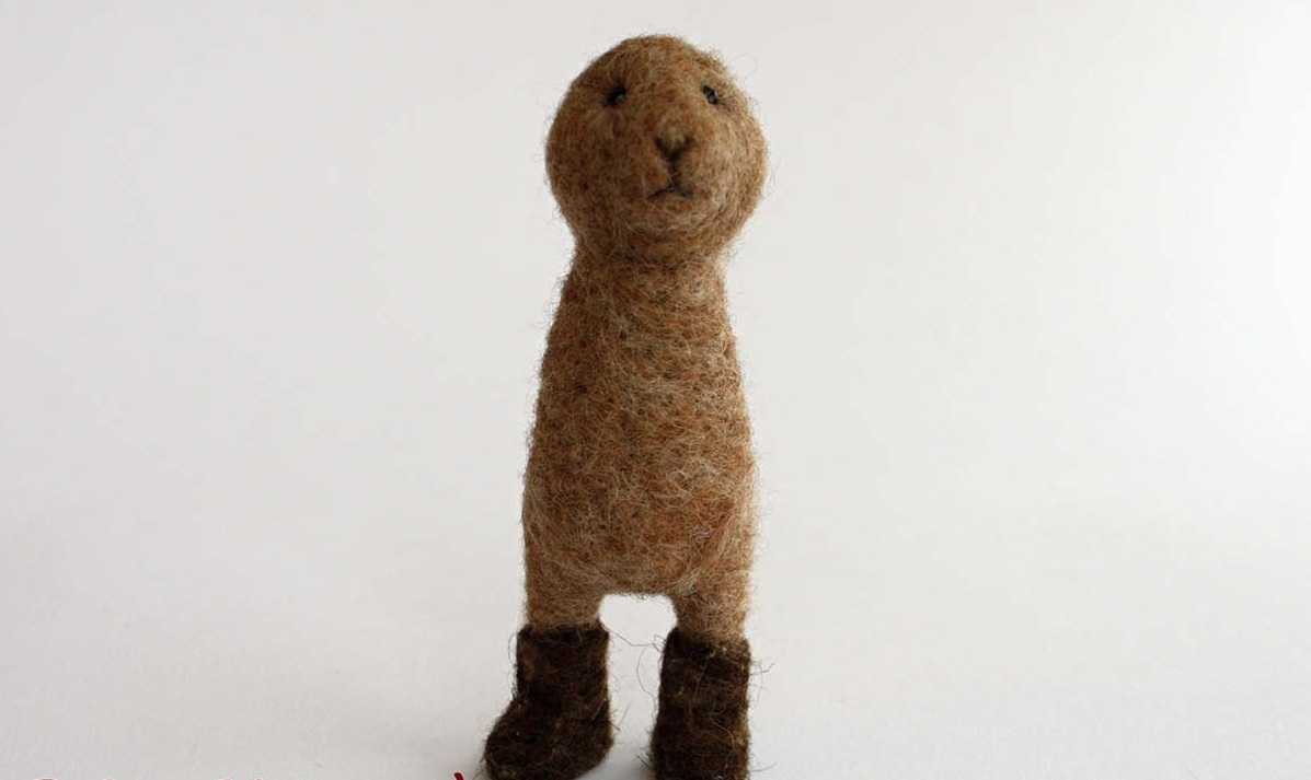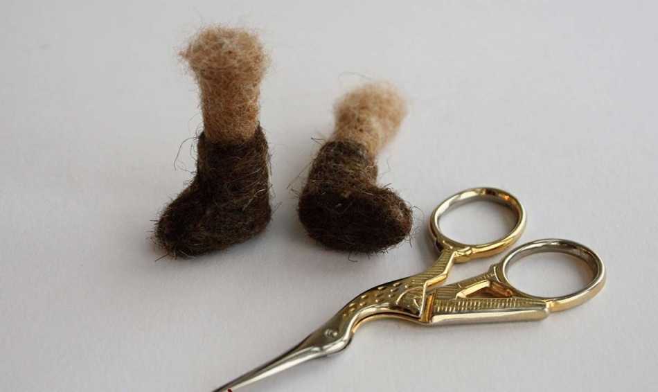 Теперь сформируйте коричневые шерстяные сапоги сначала толстыми, а затем тонкими иглами. Лишние волосы аккуратно подстригаются