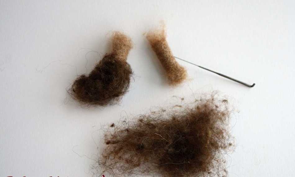 Когда крупные элементы будут готовы, следует переходить к изготовлению мелких (ушей, лап). Чтобы придать им необходимый изгиб, требуется согнуть их пальцами и проработать место изгиба средней иголкой. После выполнения всех заготовок их следует соединить между собой с помощью заранее оставленных прядей. Детали нужно приложить симметрично, для удобства можно приколоть их булавкой.