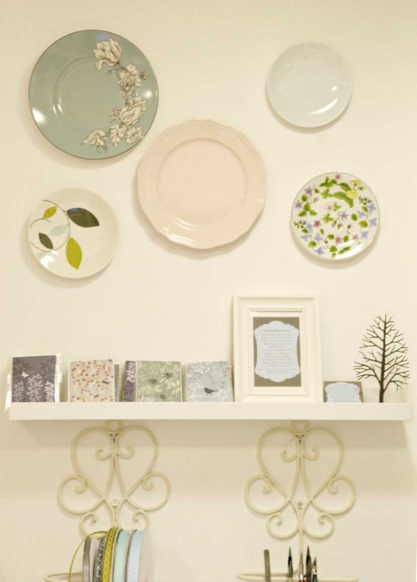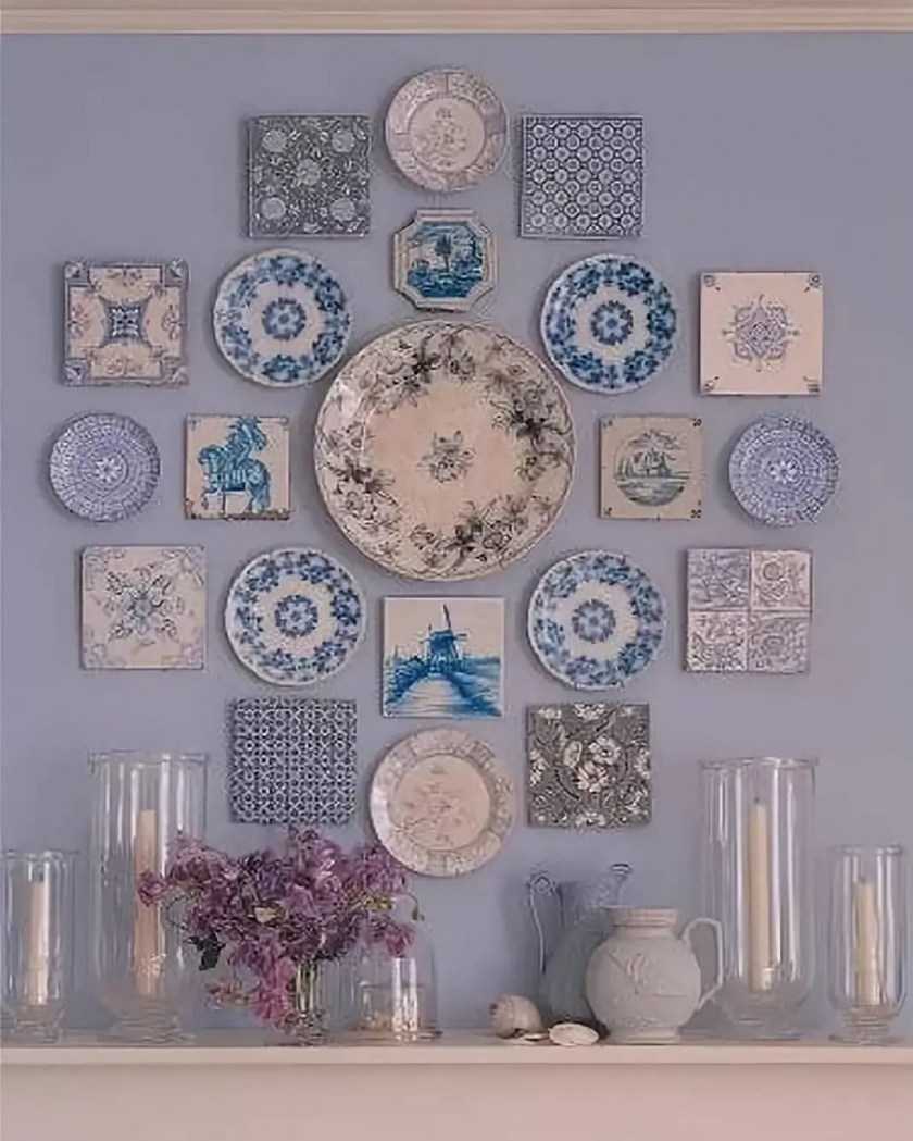 Сочетайте коллаж из посуды с другими элементами декора: очень красиво будут смотреться тарелки рядом с вазами или настенными бра.