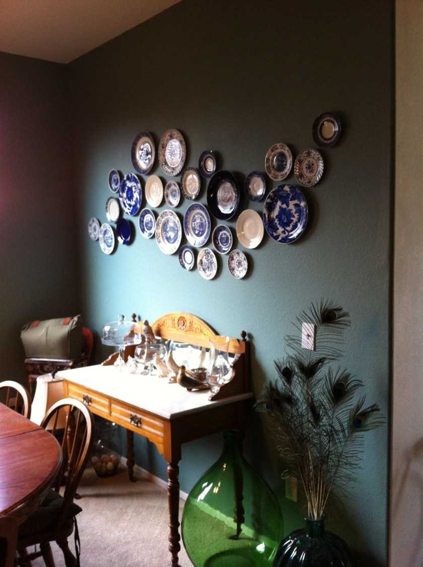 Любителям упорядоченности и симметрии можно развешивать тарелки линиями или геометрическими фигурами. Ровные линии одинаковых по размеру тарелок, или постепенный переход от самой маленькой тарелки к самой большой. Можно сделать круг, овал или квадрат из тарелок вокруг зеркала или картины.