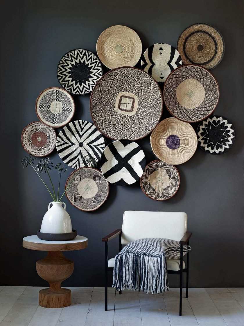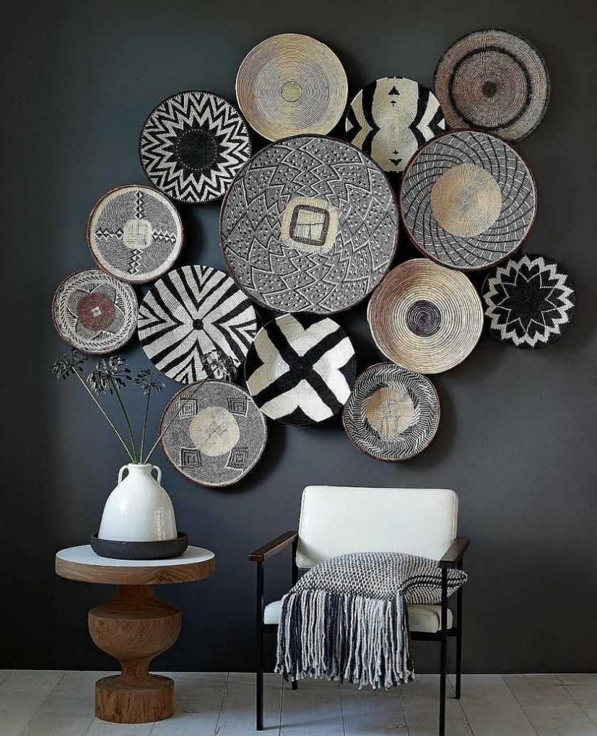 Гармоничное сочетание декоративных изделий разных размеров и форм на темной стене