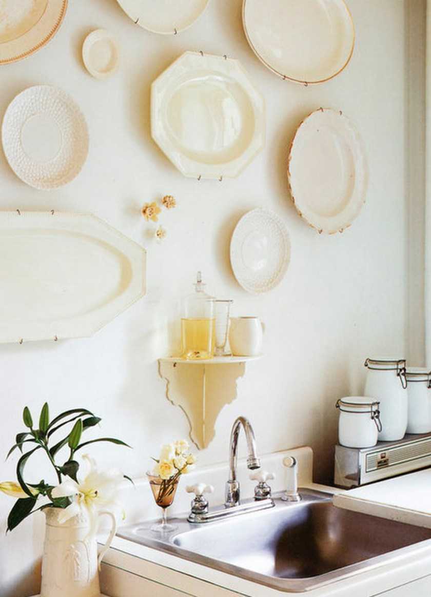 Сочетайте тарелки с дизайном помещения. Для классического стиля подходят фарфоровые с цветочными рисунками в бело-синей цветовой гамме или позолоченные. Для современного стиля используют яркие и пестрые образцы. А в стиле кантри идеально будет смотреться белая или кремовая керамическая посуда.