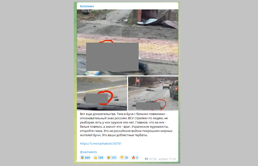 Один солдат спрашивает другого: « — Вон пацаны без синих повязок, можно по ним стрелять? — А то, ***!» . На видео нет тел с синими повязками. На тех, где они есть — они белые, что является опознавательным знаком для россиян. Житель с белой повязкой воспринимался как нейтральное или союзное российским войскам лицо.