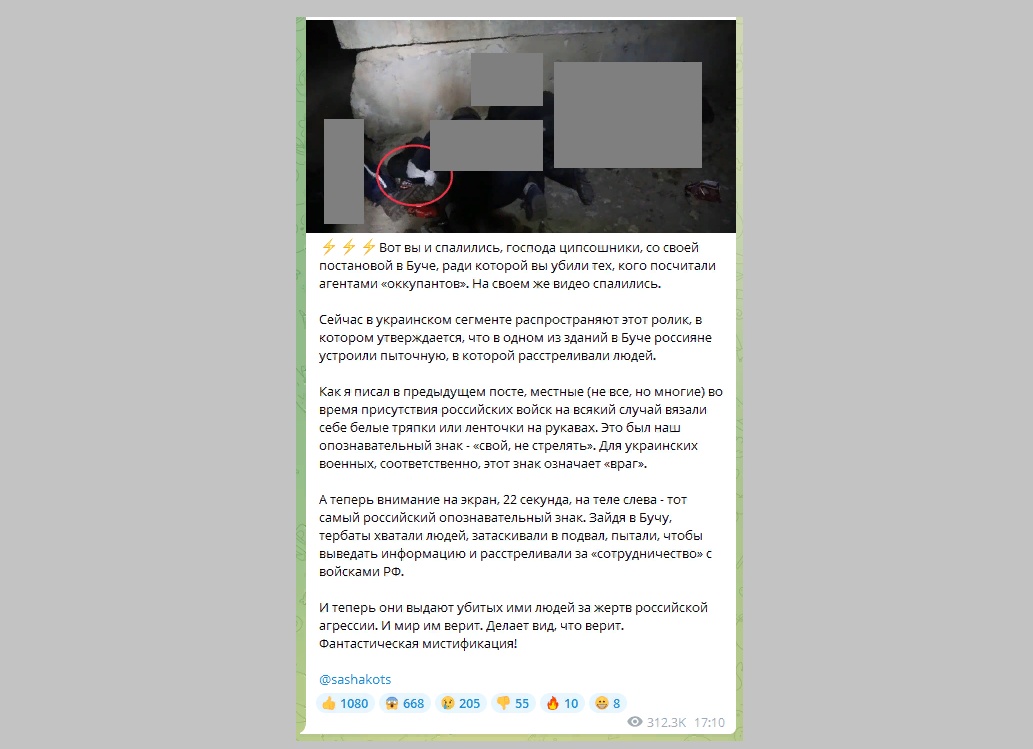 На украинском телевидении появляется второй сюжет, в котором утверждается, что в одном из зданий в Буче ВС РФ устроили пыточную, в которой расстреливали людей. При внимательном просмотре можно заметить ту же самую «белую повязку». А значит, по словам военкора Александра Коца, тероборона захватывала и пытала людей, чтобы выведать информацию и расстреливала за «сотрудничество» с российскими войсками.