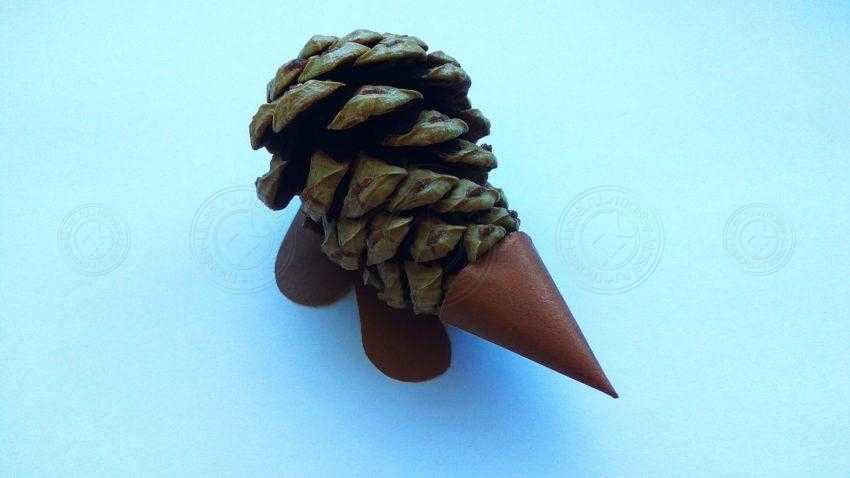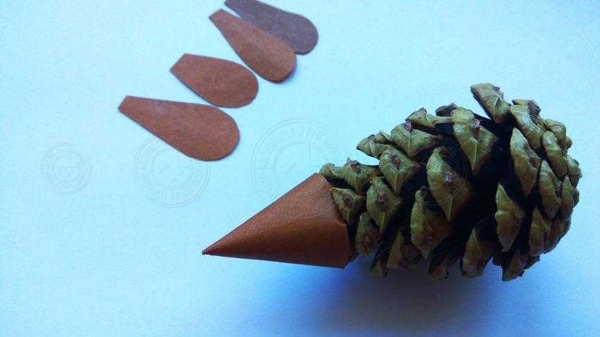 11. Все лапки подклейте снизу к фигурке, также воспользуйтесь надежным клеем. Даже если изначально шишка у вас неустойчивая и переворачивается, то после того, как вы приклеите лапки, ежик уже будет уверенно стоять. Тем более, если вы сделаете эти детали из плотного картона. То есть лапки выполняют ту же функцию, что и у живого ежика.