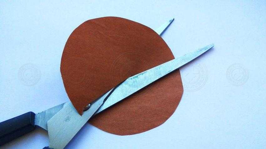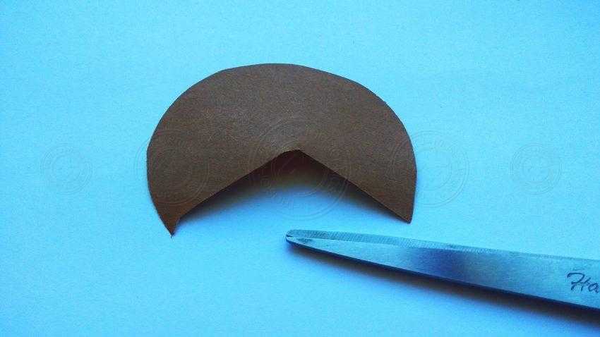 7. Чтобы сделать мордочку ежика, воспользуйтесь ножницами и коричневой бумагой. Для начала вырежьте круг и надрежьте его по одному радиусу.