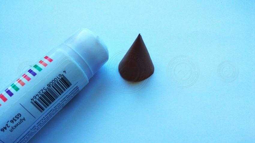 9. Из остатка круга скрутите конус. Одну сторону промажьте клеем, затем затяните и придавите вдоль. Желательно примерять этот конус к узкой части шишки, ведь он предназначен для мордочки ежика, а потому желательно, чтобы широкая часть конуса идеально состыковывалась с основой.