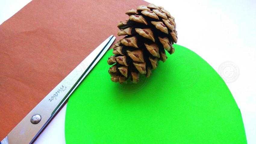 1. Возьмите для работы необходимые материалы. Зеленый понадобится для того, чтобы сделать островок, на котором будет находиться фигурка и имитации травы. Шишка станет центральной частью поделки, а из коричневой бумаги вы сделаете дополнительные детали.