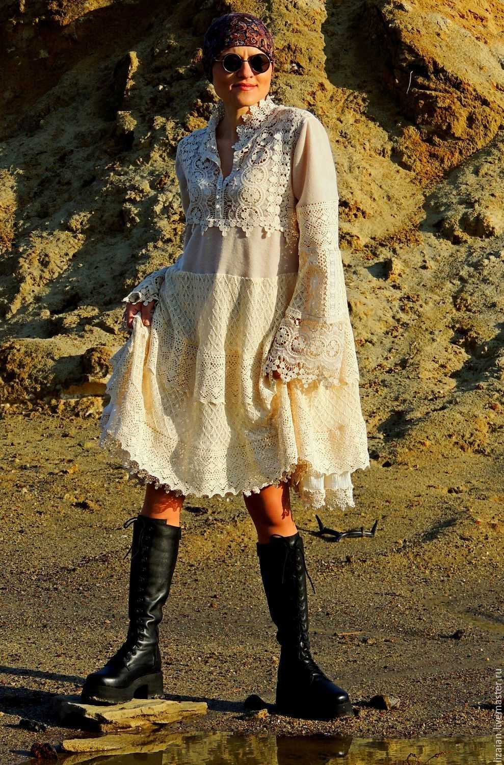 Белое платье, которое было связано при помощи спиц или крючка — слабость поклонниц стиля бохо. Цветные варианты также популярны. Все эти варианты схожи своими свободными фасонами, естественностью и простотой, которые очаровывают.
