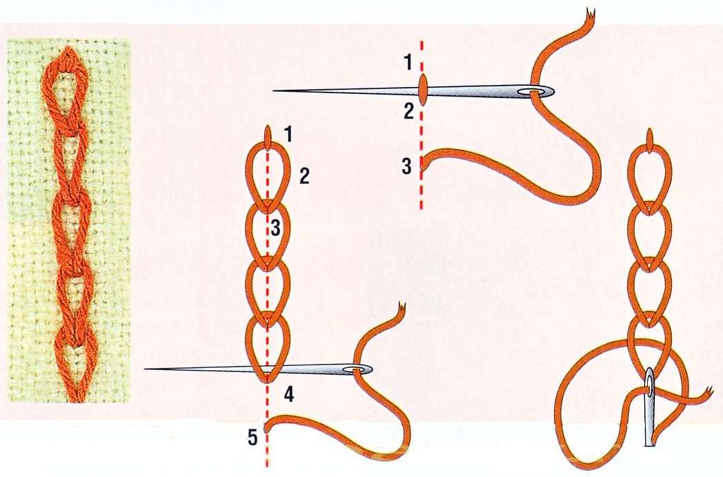 - Шов с обвивом. Закончив вышивку, обвейте цепочку ниткой такого же или другого цвета. Нить можно прокладывать разными способами, получая красивый и объемный шов: