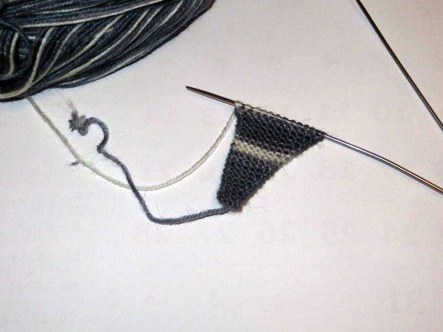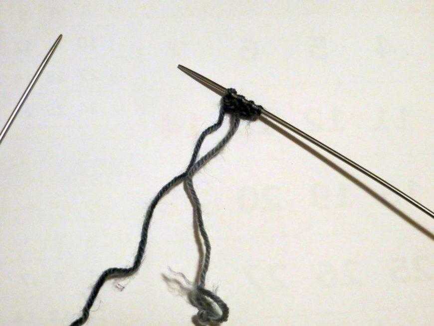 - На две спицы наберите три петли. Начните вязать изделие лицевыми петельками. Когда провяжите четыре ряда, сделайте прибавление. Последующие 3 ряда провязываете одними лицевыми петлями и в лицевом, и в изнаночном ряду.