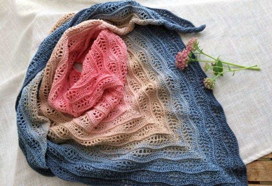 Ещё один вариант шарф выполненный по типу волны. Для этого используют специальную схему вязания бактуса, в которой чередуют лицевые и изнаночные ряды.