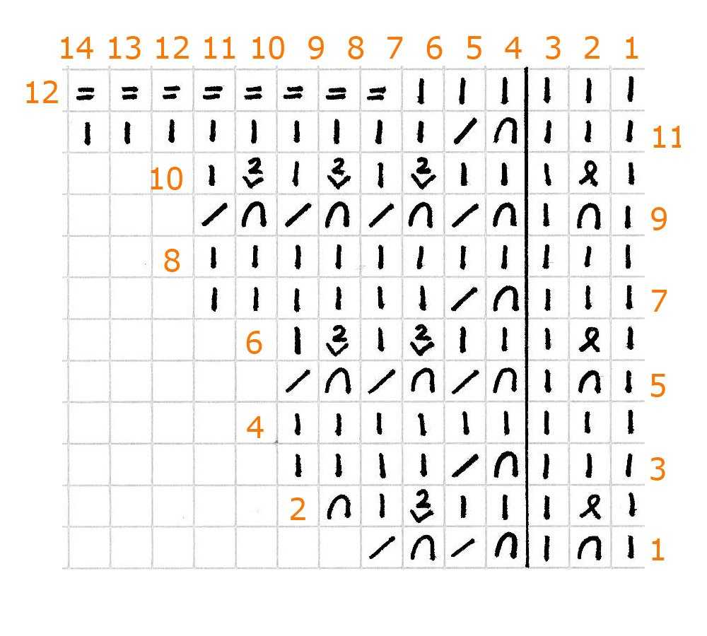 - 19 р: 3 лиц., 2 вместе лиц. 3 раза; 1 нак., 1 лиц., 1 нак., 1 лиц., 1 нак., 1 лиц., 1 нак., 1 лиц., 1 нак., 1 лиц., 1 нак., 2 вместе лиц. 3 раза, повторить 5 раз; 2 вместе лиц. 3 раза; 1 нак., 1 лиц., 1 нак., 1 лиц., 1 нак., 3 лиц. (1 нак., 1 лиц., 1 нак.), дальше вяжем в зеркальном отражении, в конце р. возд. п.;