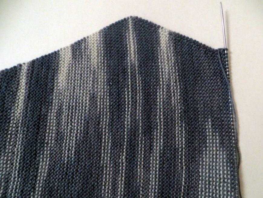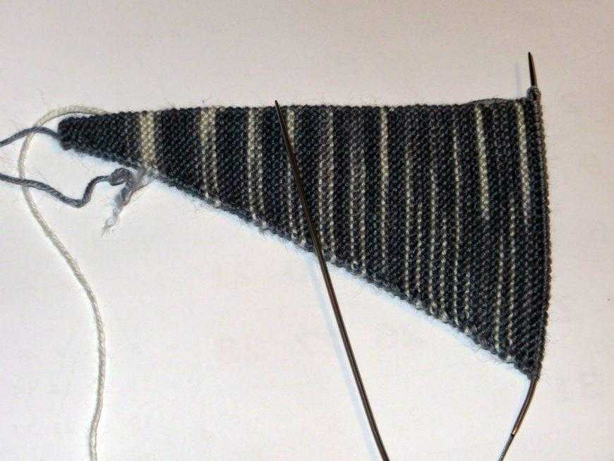 Схемы вязания с описанием в мельчайших деталях нам не потребуется. Просто набираем четыре петли и вяжем три ряда только лицевыми петлями. Это и есть платочный узор. В четвёртом ряду нужно добавить петлю. Конечно, можно перед последней петелькой ряда выполнить накид –так как это просто, однако тогда образуется дырочка, и каждые четыре ряда, когда будет прибавка петель, у нас будут появляться отверстия. Дабы избежать «дырчатого края», можно провязывать накид так, чтобы он перекручивался. Ещё один способ прибавки петель без дырочек – это вывязывание из протяжки. Разберёмся, как связать это место:
