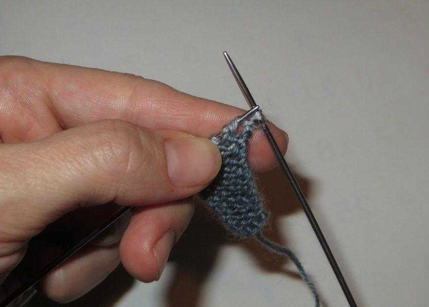 Теперь начинаем делать убавление петель в каждом втором ряду с той стороны, где и прибавляли петли. Для этого кромочная петля в начале ряда снимается, а две последующих петли провязываются вместе лицевой петлей.