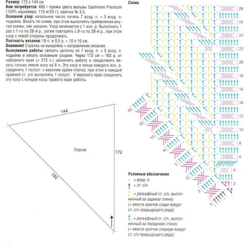Чтобы не возиться с расчётами, но при этом сотворить симметричный аксессуар, следует выбрать простой платочный узор и начать вязание с острого угла.