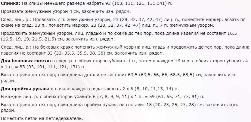 Расход пряжи 450 (500) 550 г для размеров 38/40 (42/44) 46/48, спицы №5,5.