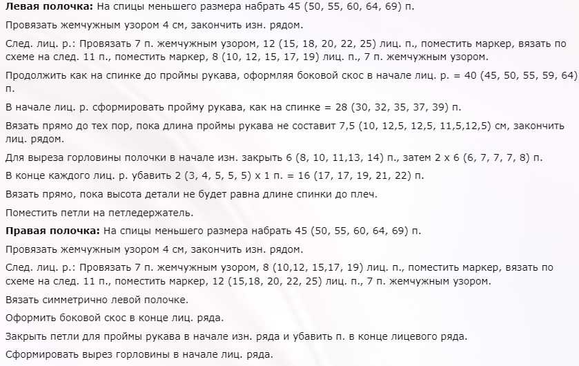 ПРАВАЯ ПОЛОЧКА Вязать на крайних петлях справа, проймы сформировать, как на спинке.