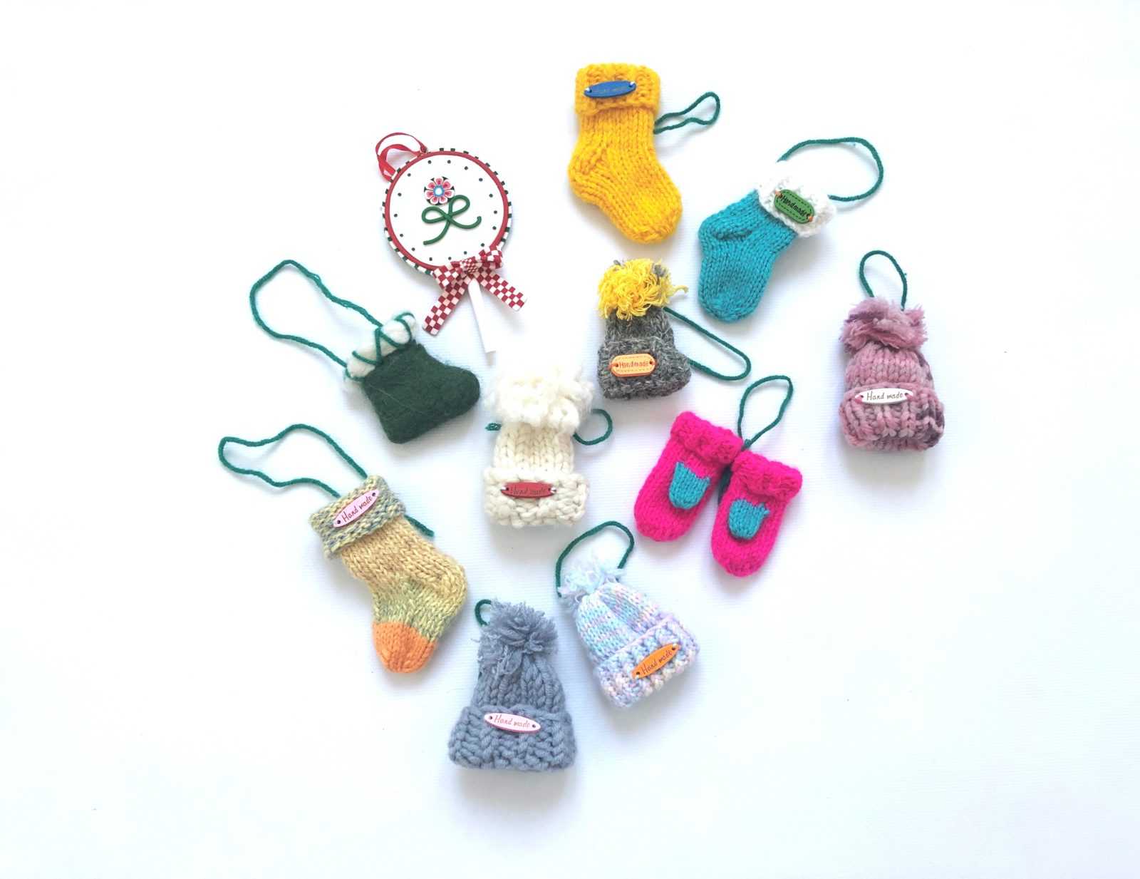 Самые простые схемы вязания новогодних игрушек сводятся к мини-версиям варежек, шапочек и носочков. Можно использовать остатки пряжи.