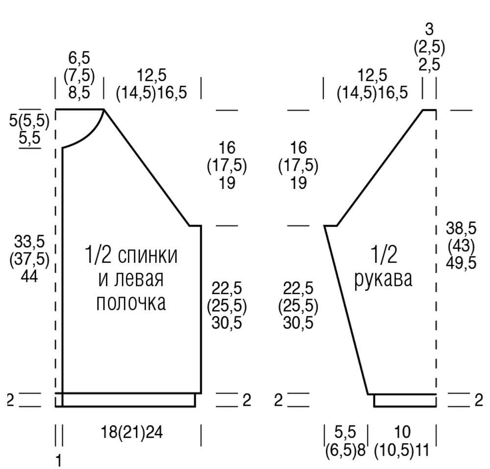 Схема узора очень проста. Свитер вяжется только лицевыми петлями в лицевых и изнаночных рядах. Это называется платочная вязка. Выкройка приведена ниже. Она максимально проста с прямыми рукавами, без пройм и сложной горловины.