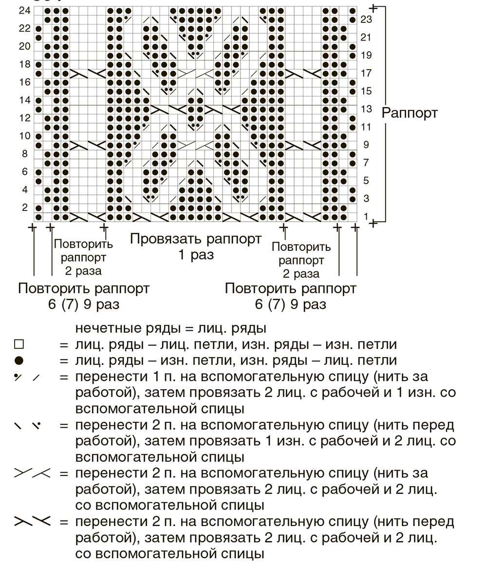 Ажурный узор вяжем по схеме раппорт 6 рядов. В четных рядах – л/п. Схема узора выглядит так:
