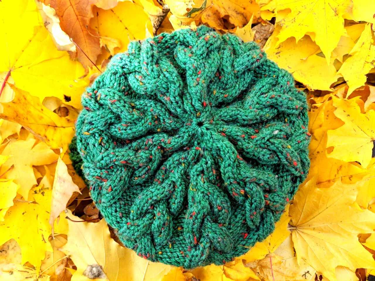 Шапка-бини с араном — вяжется достаточно просто, вся сложность в переплетении арана. На схеме номер 2 показано, как делать макушку шапки. Подходит на ОГ — 55-56 см. Высота изделия 22 см.