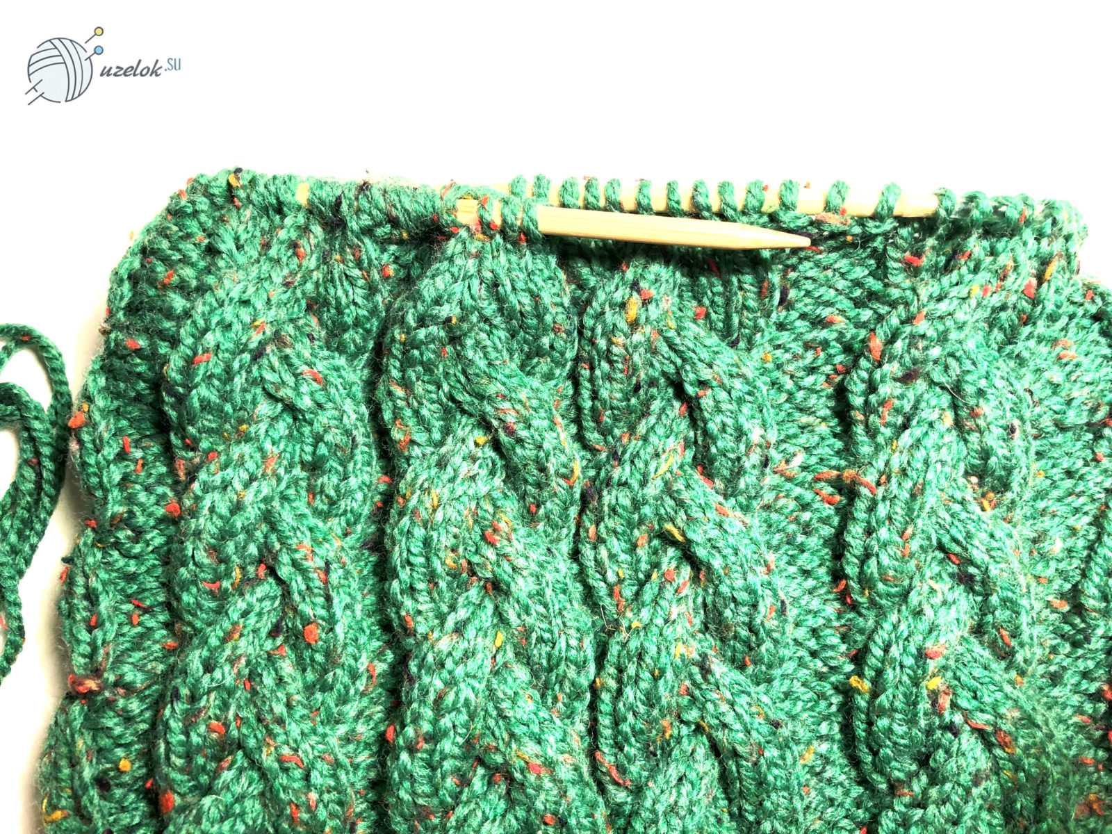 После перехлеста вяжем три ряда по рисунку. Можете воспользоваться счетчиком рядов.