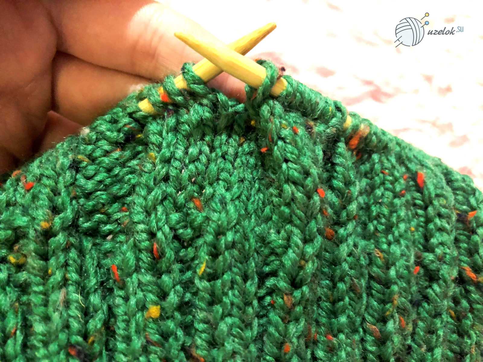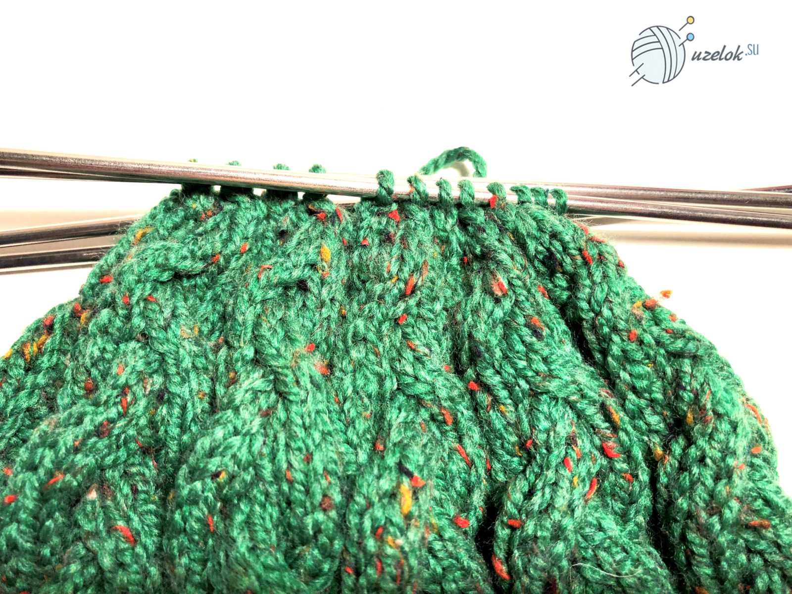 - Перед самым завершением шапки спицами с поперечным узором трижды выполнить убавления в каждом втором ряду, провязывая все петли вместе по 2.