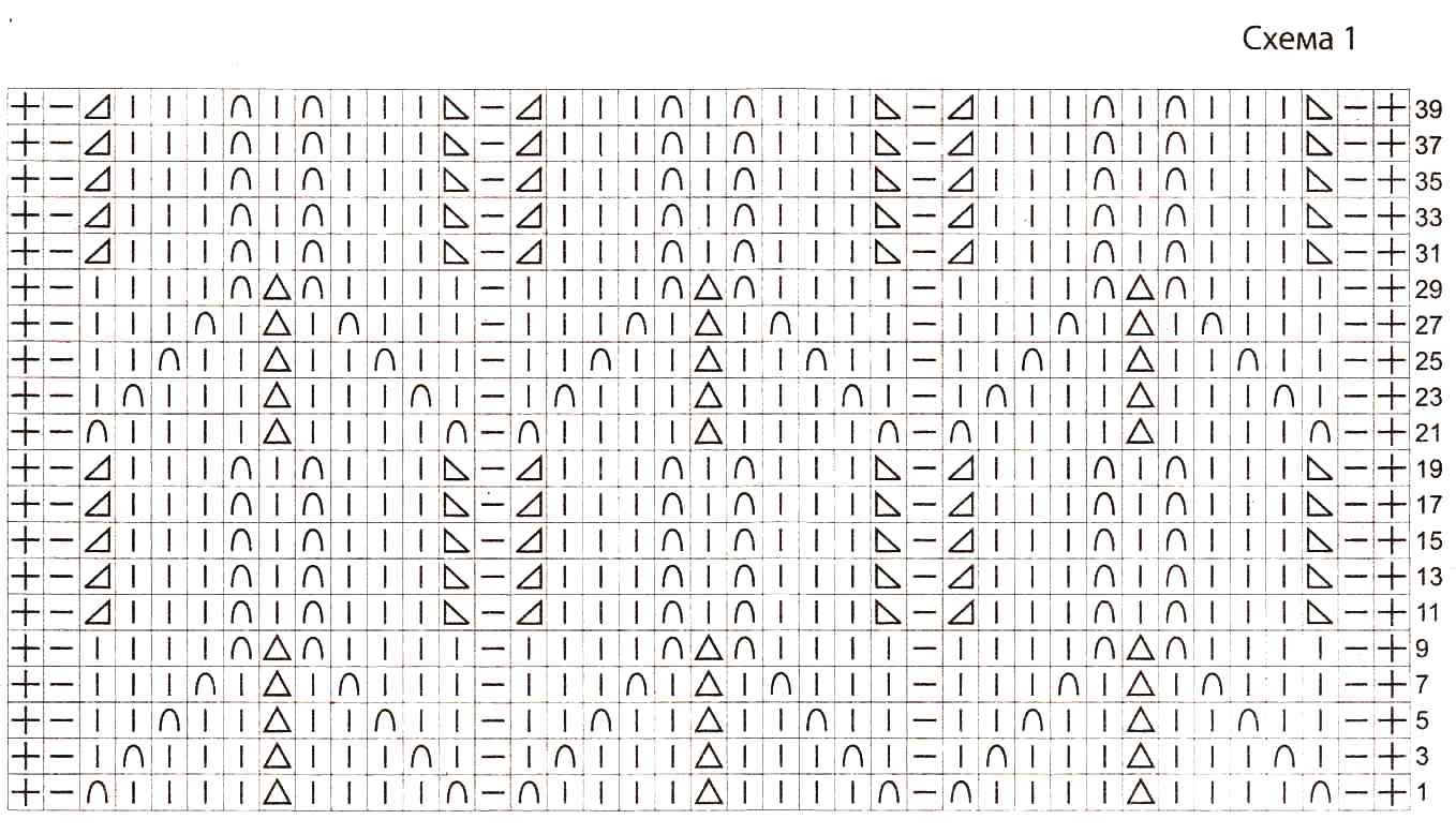 131 в. п., далее по схеме 1 до высоты 38 см, где закрываем для пройм с двух сторон по 8 п. и далее прямо до высоты 56 см, где закрываем для выреза горловины средние 91 п. и по две стороны от них в кaждoм p. 4 х 1 п. (= 8 п.) для плеч. Заканчиваем вязание на высоте 60 см.